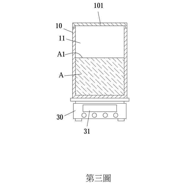 重量計上には、容器を配設し、前記重量計には、第1の基準重量値及び第2の基準重量値を設定し、前記第2の基準重量値は、前記第1の基準重量値より大きく、前記容器中に液体を注入し、液体の重量が前記第1の基準重量値に等しい場合、液体の前記第2の液位は、前記第3の段部上に設けた低目盛線に位置し、液体の重量が前記第2の基準重量値に等しい場合、液体の前記第2の液位は、前記第3の段部上に設けた高目盛線に位置することが好ましい。