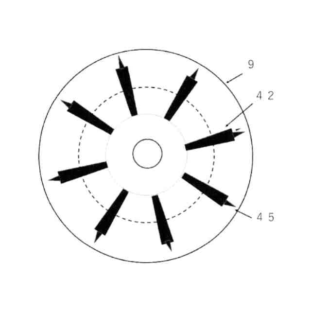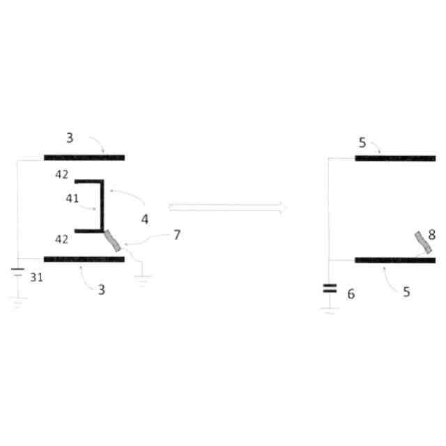 主要部品は、充電電位源3(例えば、充電電極または充電エレクトレット、以下充電電極と表記した場合でも充電エレクトレットも含まれる、なお、以下の説明において、電圧を印加した電極で、シミュレーションが行われるが、同電位のエレクトレットでもほぼ同じ結果が得られる。本特許の説明は主に電極を使用して行われるが、製品化に際してはすべてエレクトレットに置きかられる)、横置き樋型の電荷搬送体4と、回収電極(装置構成によっては電荷回収部と表記される)5のみである。電荷搬送体4は、その進行方向と平行な上下水平板42と、その前方にあって進行方向と垂直な垂直板41で構成される。該水平板42と垂直板41は充電電極で充電された電荷の保持層である。但し、実際の装置には、そこに、充電電極電源31、回収電極コンデンサー6、電荷を注入する導電性端子7と、電荷を回収する導電性端子8が加わるが、以下、簡略化のため、主に主要部品のみについて説明する。