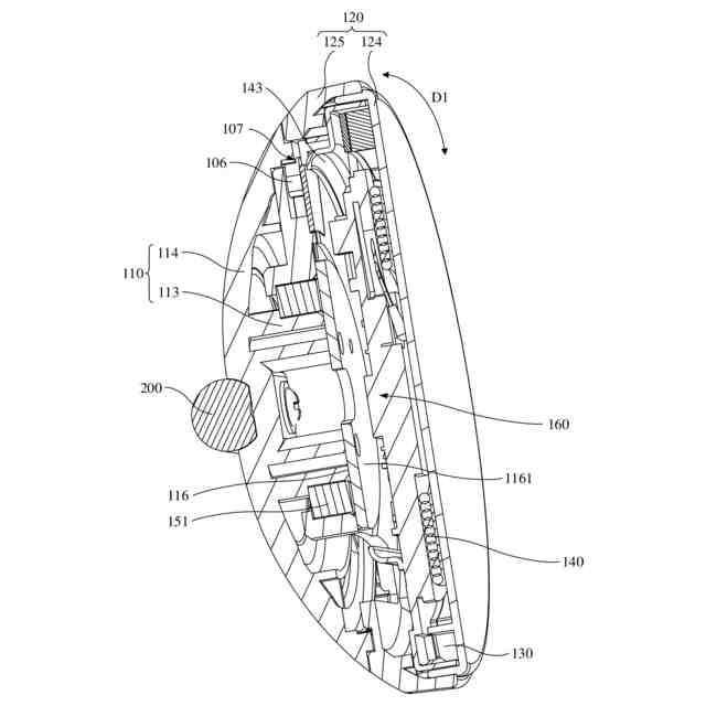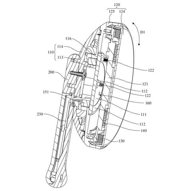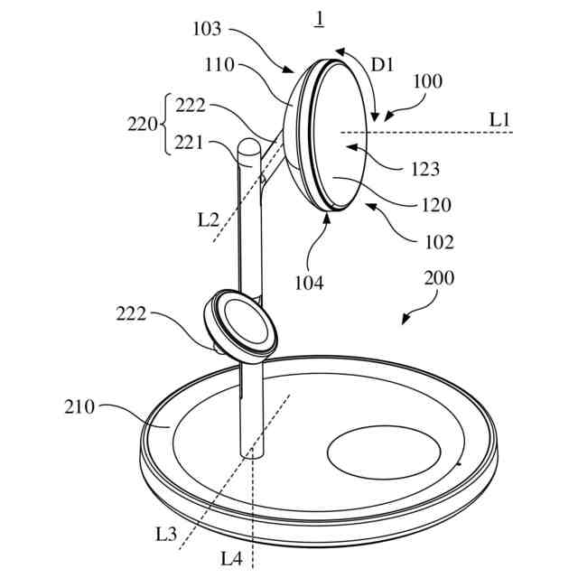 図1~図3に示すように、本願のワイヤレス充電装置の実施例に説明されるワイヤレス充電装置1は、ワイヤレス充電モジュール100及び支持機構200を含む。ワイヤレス充電モジュール100は、第1ケース110、第2ケース120、磁気吸引アセンブリ130、及びワイヤレス充電アセンブリ140を含む。第2ケース120は、第1ケース110に回転可能に接続され、第2ケース120は、第1ケース110の周方向D1に沿って回転可能である。ワイヤレス充電アセンブリ140は、第2ケース120又は第1ケース110に接続され、充電対象機器を充電する。磁気吸引アセンブリ130は、第2ケース120又は第1ケース110に接続され、第2ケース120には、ワイヤレス充電アセンブリ140に対応する充電領域123が形成され、磁気吸引アセンブリ130は、磁力によって充電対象機器を充電領域123に位置制限する。支持機構200は、第1ケース110に接続され、ワイヤレス充電モジュール100を支持する。