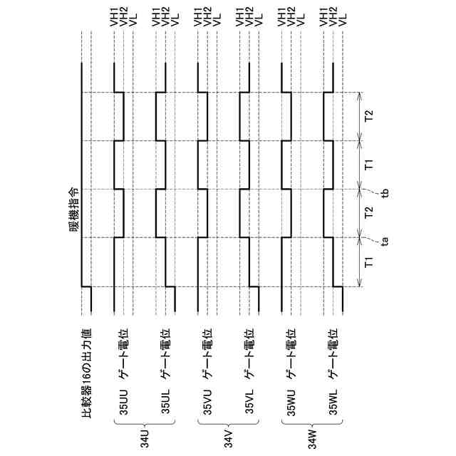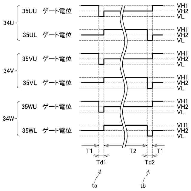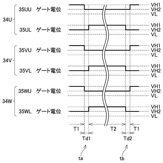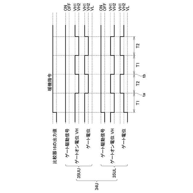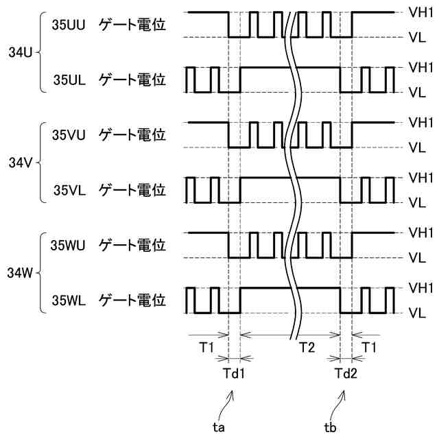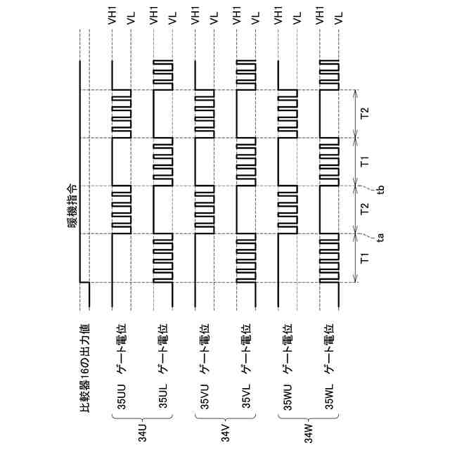 実施例1の暖機動作中におけるスイッチング素子35UU、35ULに対する制御信号を示すグラフ。