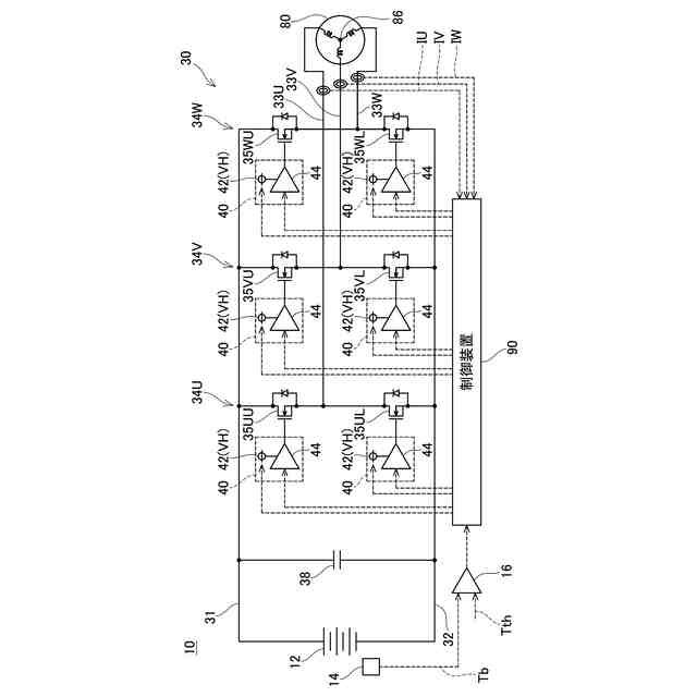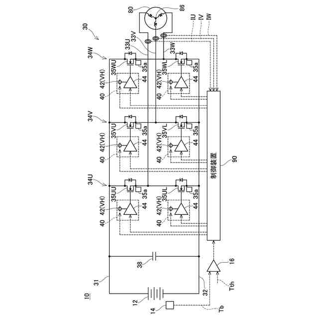 図1に示す電気回路10は、車両に搭載されている。電気回路10は、バッテリ12、インバータ30、モータ80、及び、制御装置90を有している。バッテリ12は、車両のメインバッテリであり、直流電力を出力する。モータ80は、三相モータであり、車両の駆動輪を回転させる。インバータ30は、バッテリ12から供給される直流電力を交流電力に変換してモータ80に供給する。これにより、モータ80が駆動輪を回転させ、車両が走行する。制御装置90は、電気回路10の各部を制御する。制御装置90は、1つの回路基板によって構成されていてもよいし、物理的に離れた位置に配置された複数の回路基板によって構成されていてもよい。