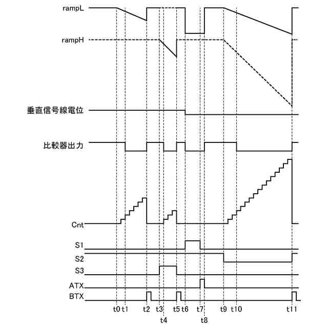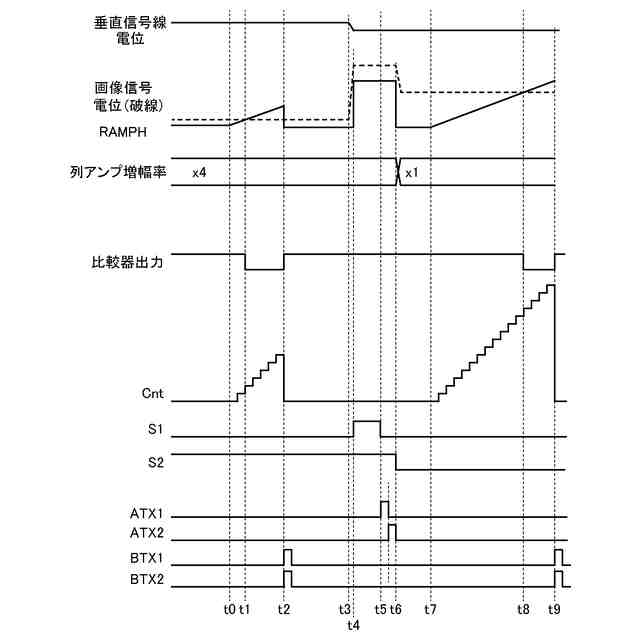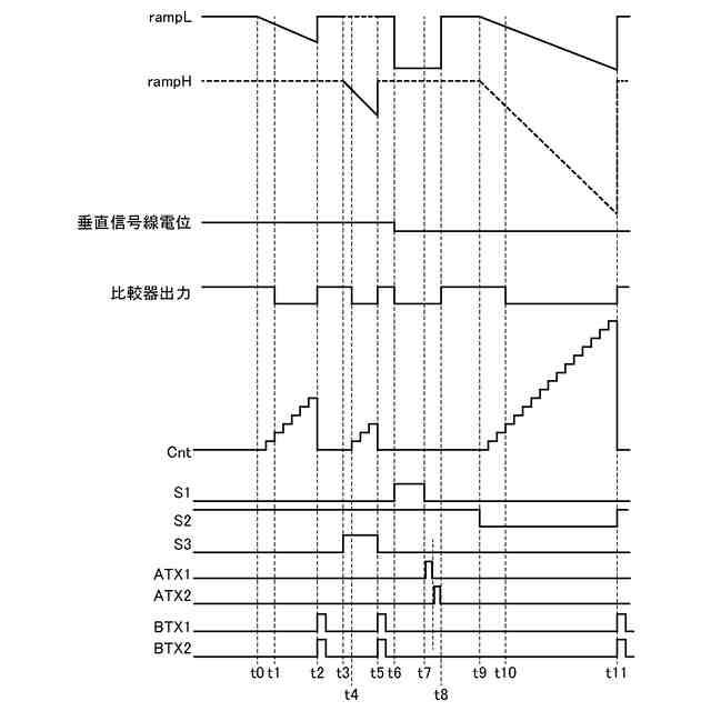 行列状に配置された画素の列ごとにアナログデジタル(AD)変換器を配置して、ランプ信号を用いてAD変換する技術がある。特許文献1には、時間に対する電圧の変化が互いに異なる2つのランプ信号を用いてAD変換する撮像装置が開示されている。
