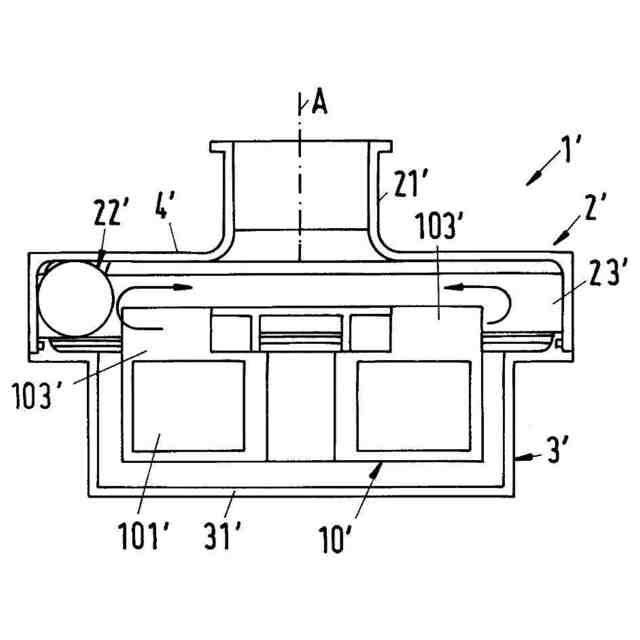遠心力ポンプ200’は、ステータ100’と、ポンプ・ユニット1’と、を備える。より良好に理解することができるように、図2は軸方向Aからのポンプ・ユニット1’の上面図を示し、図3は図2の線III-IIIに沿う断面図でポンプ・ユニット1’を示す。