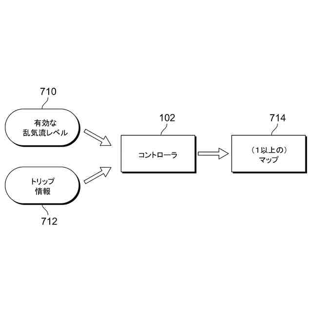[0017] 一実施形態による、有効な乱気流レベルを受信し、その有効な乱気流レベルとトリップ情報に基づいて1以上のマップを生成する、乱気流通知システムのコントローラを示す。