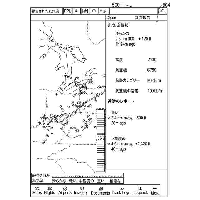 [0008] 本開示の特定の複数の実施例は、1以上のプロセッサを有するコントローラを含む乱気流通知システムを提供する。該コントローラは、報告する航空機が飛行している間に複数の報告する航空機によって生成された気流報告を取得するように構成されている。気流報告の各々は、気流報告を生成したそれぞれの報告する航空機の地理的位置、それぞれの報告する航空機が経験した報告された乱気流レベルであって、大気気流に起因する乱気流レベル、及びそれぞれの報告する航空機の識別特性を含む。該コントローラは、気流報告内の報告された乱気流レベルと、報告する航空機のサイズ又は報告する航空機の重量のうちの少なくとも一方とに基づいて、正規化された乱気流の値を生成するように構成されている。該コントローラは、正規化された乱気流の値と第1の航空機の第1の識別特性とに基づいて、第1の航空機に固有の有効な乱気流レベルを決定するように構成されている。有効な乱気流レベルは、気流報告の地理的位置において、大気気流が第1の航空機に与える影響を予測する。該コントローラは、第1の航空機のスケジューリングされたルートと、決定された有効な乱気流レベルを表すグラフィック指標とをプロットした、マップを生成するように構成されている。該コントローラは、気流報告の地理的位置に対応するマップの垂直軸と水平軸に沿った位置において、グラフィック指標をプロットするように構成されている。