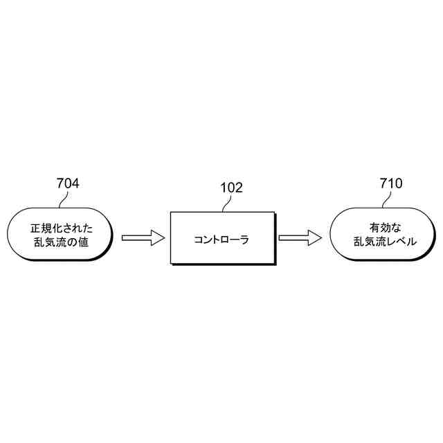 [0016] 一実施形態による、正規化された乱気流の値を受信し、その正規化された乱気流の値に基づいて有効な乱気流レベルを決定する、乱気流通知システムのコントローラを示す。