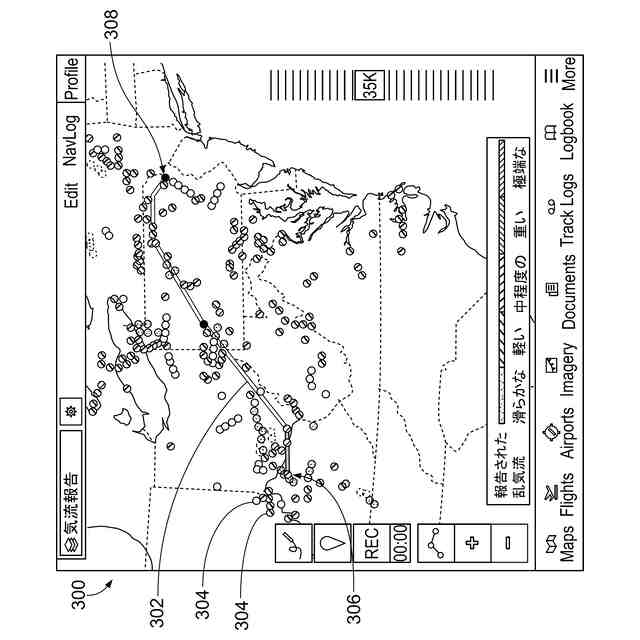 [0011] 第1の航空機のスケジューリングされたルートと、受信した気流報告内の気流の状態を表すグラフィック指標とをプロットした、トップダウン地理的マップである。
