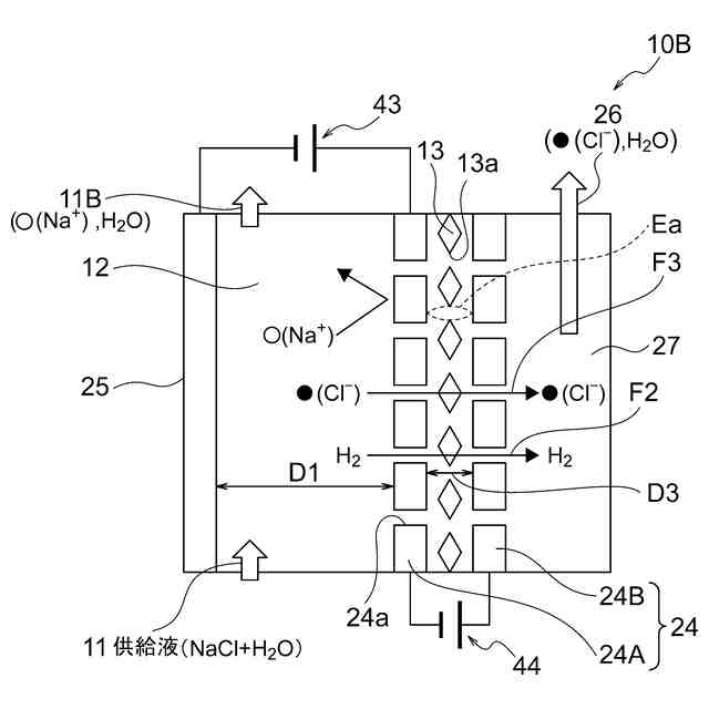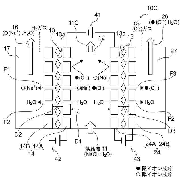 分離したプラス帯電成分が水と共に陽イオン液として流入する陽イオン室と、