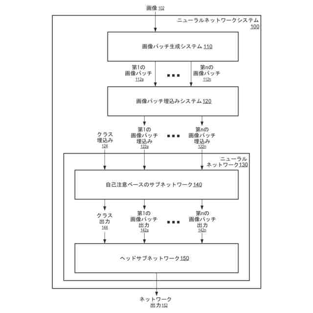 いくつかの既存のシステムは、自然言語処理(NLP)使用事例に自己注意ベースのニューラルネットワークを使用して、テキストシーケンスを処理して、テキストシーケンスについての予測を生成する。NLP領域における自己注意ベースのニューラルネットワークの利点は拡張性であり、一般に、自己注意ベースのニューラルネットワークの性能は、ニューラルネットワークのサイズが増大するにつれて向上する。しかしながら、画像に自己注意ベースのニューラルネットワークを適用する既存のシステムでは、同じことがいえず、一般に、自己注意ベースのニューラルネットワークは、より大きいアーキテクチャに拡大することができておらず、したがって、他のコンピュータビジョンシステム、たとえば、畳み込みニューラルネットワークほどうまく動作しない。たとえば、いくつかのそのような既存のシステムは、入力画像全体にわたって自己注意を適用せず、代わりに入力画像の局所近傍に適用する。したがって、画像の第1の局所近傍は、画像の第2の局所近傍に注目することができない。