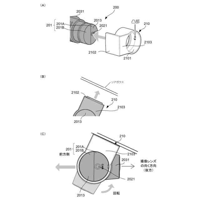 前記撮影方向の目安となる情報は、前記車室内のユーザが当該情報を目視したときに、前記撮像レンズを目視できない位置に表示される