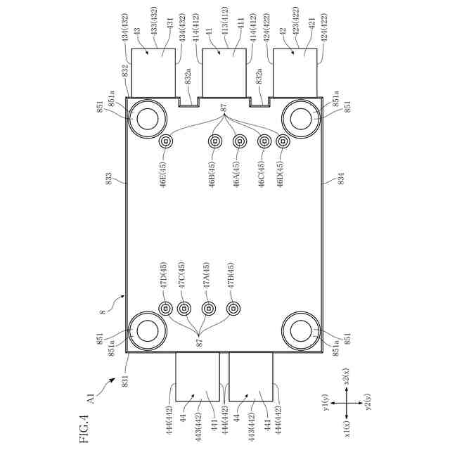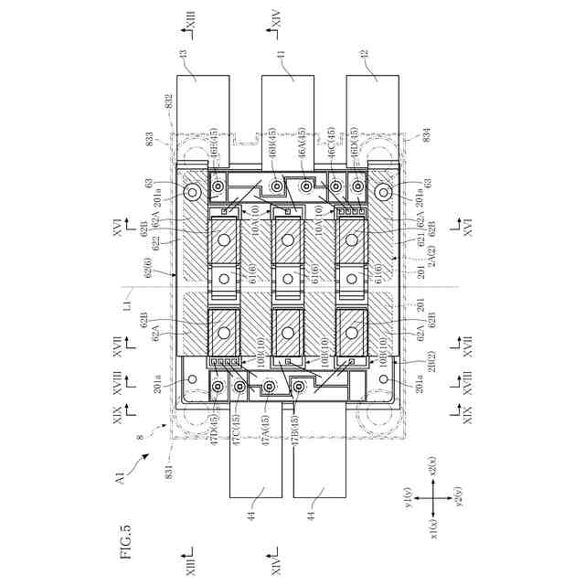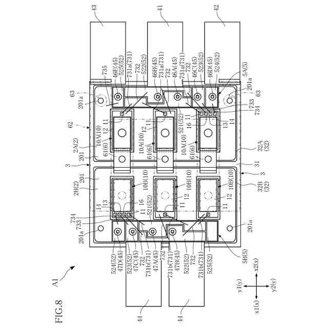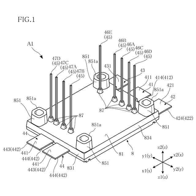 図1~図20は、第1実施形態にかかる半導体モジュールA1を示している。半導体モジュールA1は、複数の半導体素子10、導電基板2、支持基板3、複数の入力端子41~43、複数の出力端子44、複数の制御端子45、制御端子支持体5、導通部材6、第1導電性接合材71、第2導電性接合材72、複数のワイヤ731~735、封止樹脂8、樹脂部87および樹脂充填部88を備えている。