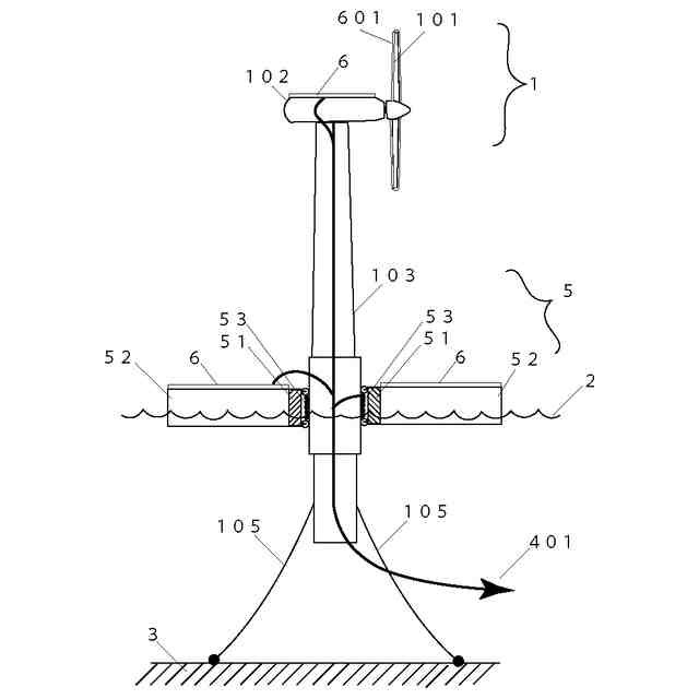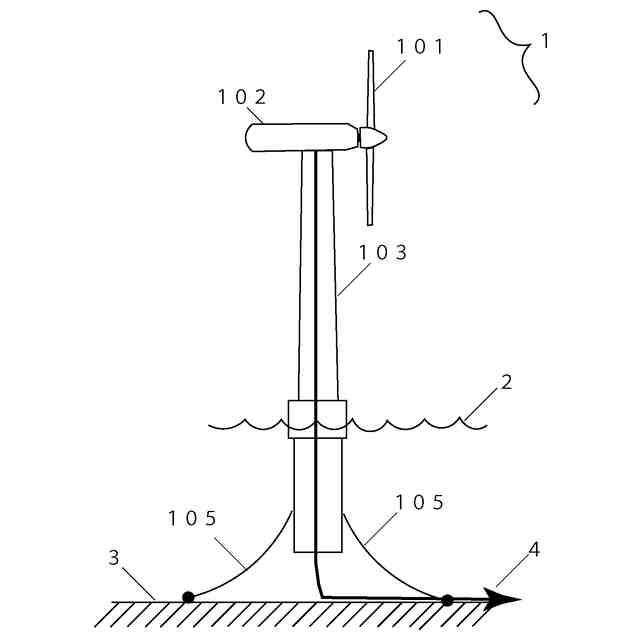 図2は、浮体式の風力発電装置1で有って、タワー103はワイヤー等タワー固定具105にて海底3固定又は漂流させる。本方式は、ある程度深度がある海(例えば水深60m以上)でも用いられる。