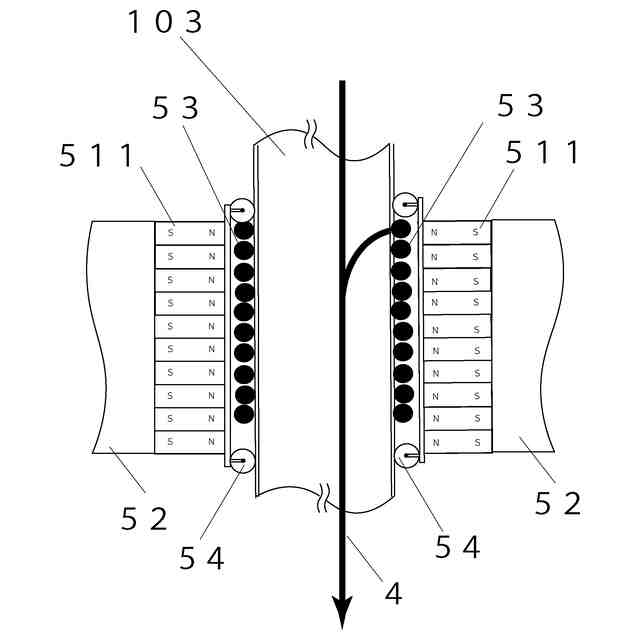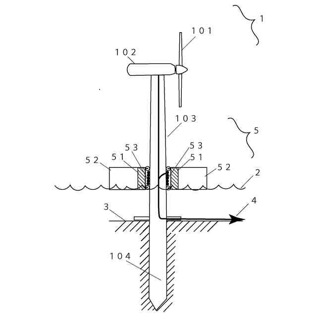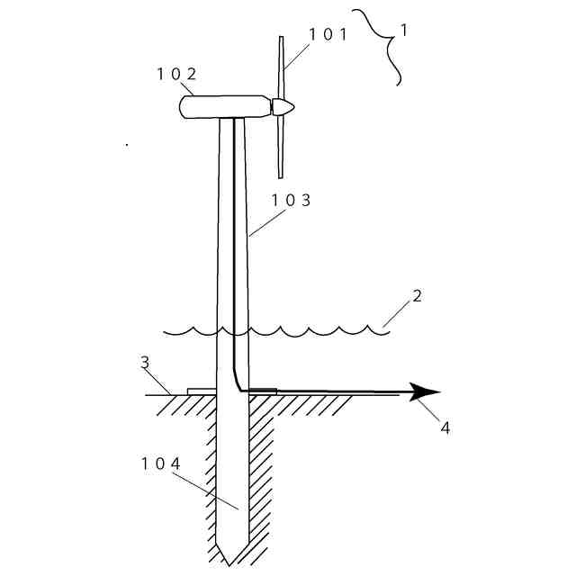 図1は、着床式の風力発電装置1で有って、海底3に基礎部分104を設け、海上2より発電用のタワー103を突出させ、上端に風車101を取り付けた発電設備を有するナセル102を設ける。発電した電気はタワー103内をとおって、海底地下ケーブル4にて陸上受電可能な場所まで送電される。