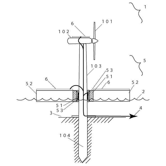 着床式の風力発電装置1は、海が深いところでは用いられず、遠浅の海岸線に近い部分に設置(例えば水深0~60m)されることとなる。風力発電装置としては、海岸に近いので、外洋の様な強い風でもないのでせっかく建設された基礎土台やインフラ設備は風力活用のみに利用されるのは、非常に効率が悪く、波や太陽光やそのほかの自然に得る事が出来るエネルギ源を効率的にどう用いるかが課題となる。