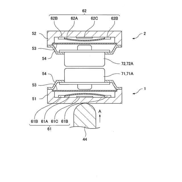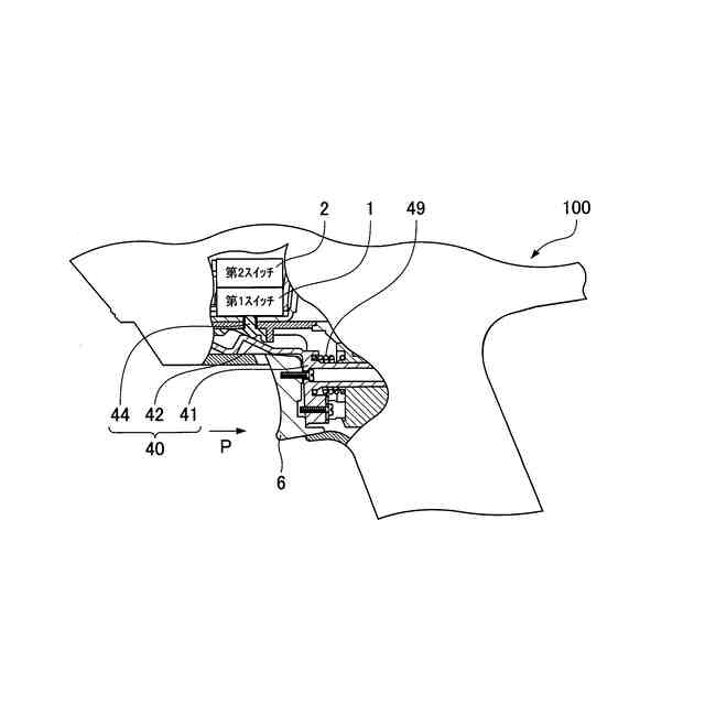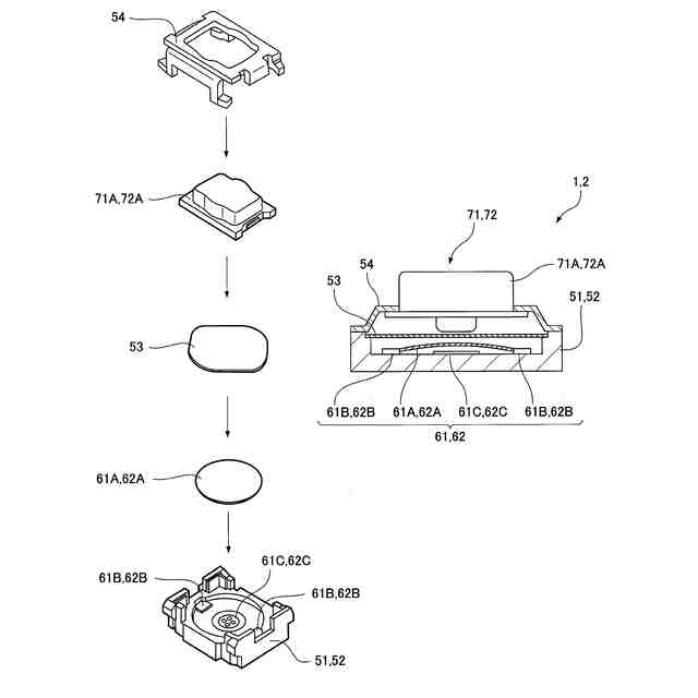 第1スイッチ又は第2スイッチの分解斜視図(左図)及び断面図(右図)である。