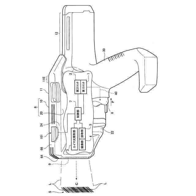 第2主面20は、第1主面10の反対面となる。把持部30は、表示部11において、所定方向Cの反対側の端部11Eから延びる。押釦6は、押込方向Pに押し込まれて撮像を開始する。第1発光部101は、側面64,66及び第2主面20の少なくともいずれか一方に設けられる。制御部7は、読取部5による読取りの状況に基づいて、第1発光部101を発光させる。