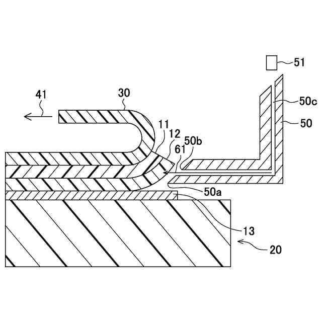 【解決手段】本発明は、テープ基材11の下面がテープ糊層12によって上面に貼り付けられたウェーハ13の下面を固定する固定機構20と、固定機構20によって固定された前記ウェーハ13上のテープ基材11の上面にリムーバーテープ30を貼り付け、リムーバーテープ30をテープ基材11の外側で且つ上側にU字状30aに折り曲げた状態でテープ基材11の上面に沿う方向41に引っ張る引張機構42と、それによってリムーバーテープ30を引っ張りながら、ウェーハ13とテープ糊層12との間に先端部50aを突き当てる突き当て部材50と、第1の噴射孔50bから気体をウェーハ13とテープ糊層12との間に噴射させる噴射機構51を有するテープ剥離装置である。