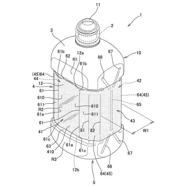 更に、シュリンクラベルの材料には主にポリエチレンテレフタレート(PET)樹脂とポリスチレン(PS)樹脂の2種類が知られており、PET樹脂製のものは比較的強度に優れ、PS樹脂製のものは比較的皺になりにくく見栄えが良いという特徴があるが、大容量の薄型のボトルには、上記のとおり大きく凹んだり、指先の力を受ける構造が多いため、事実上PET樹脂のものが多く、PS樹脂製にすることができないという課題もあった。