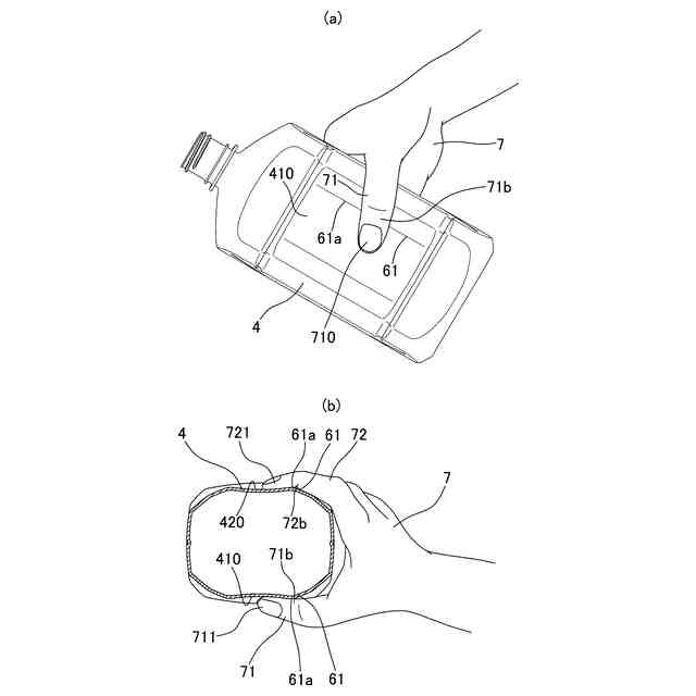 従来、この種のボトルとしては、たとえば特許文献1のように使用後にユーザが圧壊できるようにボトルの折り畳みの案内となる深さ1~1.5mm程の凹溝部を左右側面の上下にY字状に設けたり、前後面の上下に横方向に設けたものが提案されている(特許文献1参照)。このようなボトルは、胴部の最低肉厚が0.35mm以下の薄型であるため、凹溝部を案内線としてユーザが使用後のボトルを容易に折り畳み、圧壊でき、かつボトル自体の重さを抑え、材料コストも抑えることができる。