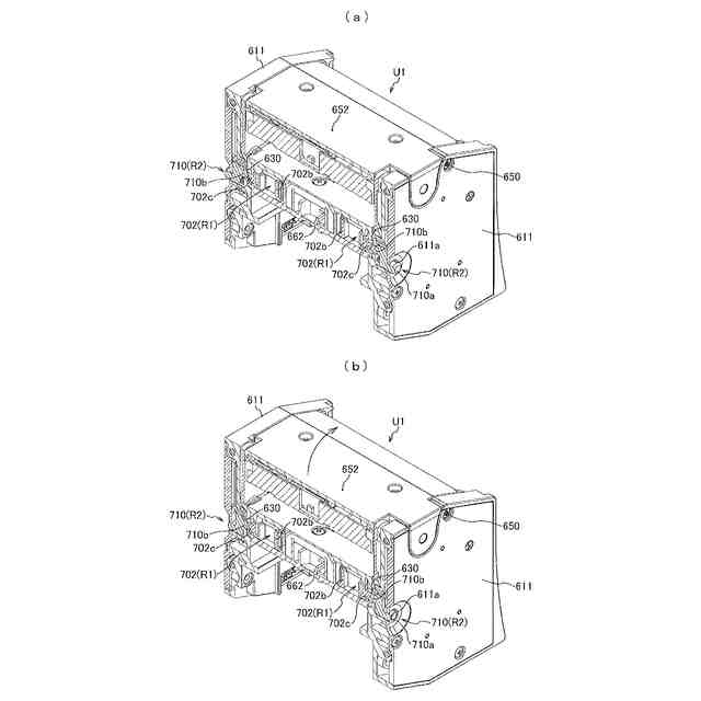(a)は回動開閉機構を作動させるラッチ機構を前面側から操作した場合の関連部品の動作を示す説明図であり、(b)はラッチ機構を側面側から操作した場合の関連部品の動作を示す説明図である。