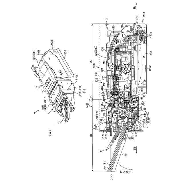 (a)及び(b)は回動開閉機構が第2の開放位置にある紙葉分離搬送装置の外観斜視図、及び内部構成を示す縦断面図である。