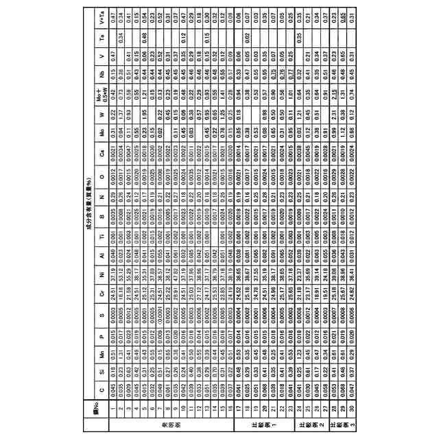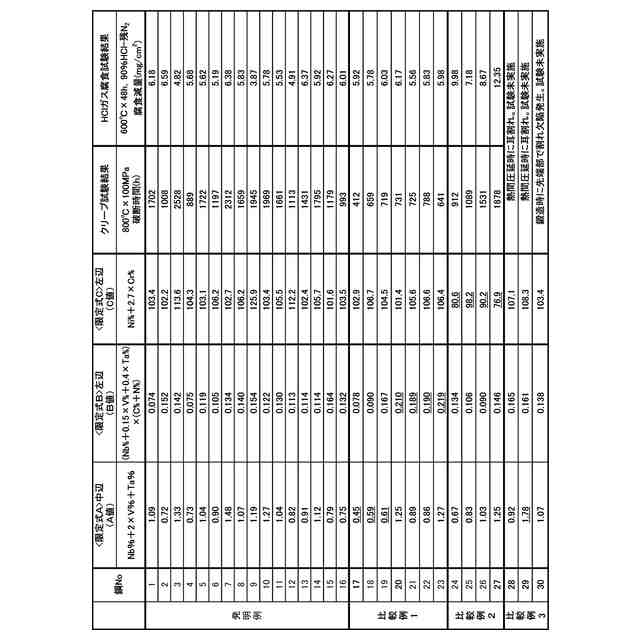 特許文献1、2はいずれも、Nbの炭窒化物の析出量を制御することでクリープ強度を高めている。ただし、特許文献1,2のいずれもNbとNの含有量の積で添加量の上限を設定していることからわかるとおり、NbはCおよびNとの固溶度積が小さい。そのため、熱間圧延後の最終熱処理(以下単に「最終熱処理」ともいう。)において、1300℃近傍まで熱処理温度を上げても未固溶の粗大な炭窒化物が残存し、特に特許文献1に記されているとおり、この未固溶炭窒化物が多すぎるとクリープ強度を逆に低下させてしまうという制約があった。そのため特許文献1、2の成分系では更なるクリープ強度の向上は困難と考えられていた。ASTM N08120は、特許文献1、2の一部がこの規格に該当するが、ASTM N08120で範囲を規定された成分のみで特許文献1、2の課題を解決しクリープ強度をさらに高めることは困難であった。加えて、これらの特許文献1,2はいずれも高温での耐HClガスに対する耐食性が考慮されておらず、耐HClガス腐食性とクリープ強度をともに高い水準で確保した鋼が要望されていた。