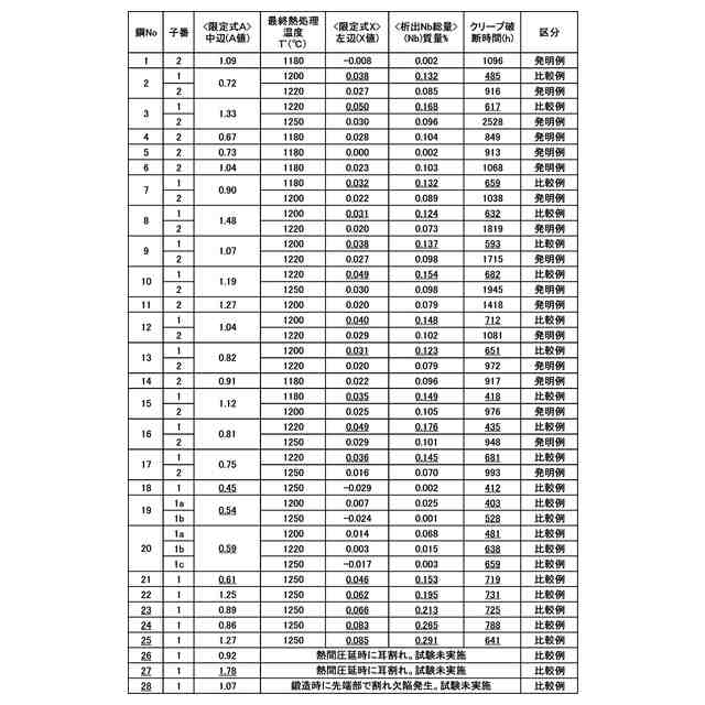 また、特許文献1で示唆されているように、これらの成分系で十分なクリープ強度を付与するには、最終熱処理において1250℃~1300℃といった超高温域で加熱することが望ましいが、1250℃を超える熱処理は炉体に与えるダメージが大きいため炉のメンテナンスコストの増大につながる。またこのような能力を有する設備を標準装備した鋼板製造メーカーは限られており、製造設備の能力に応じた成分設計を行う必要がある。そのため、熱処理炉の能力に応じた成分設計が可能な鋼も求められていた。