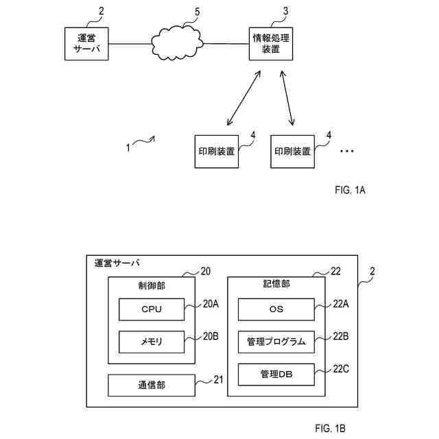図1Aは、第1実施形態の印刷システムのブロック図である。図1Bは、第1実施形態の運営サーバのブロック図である。