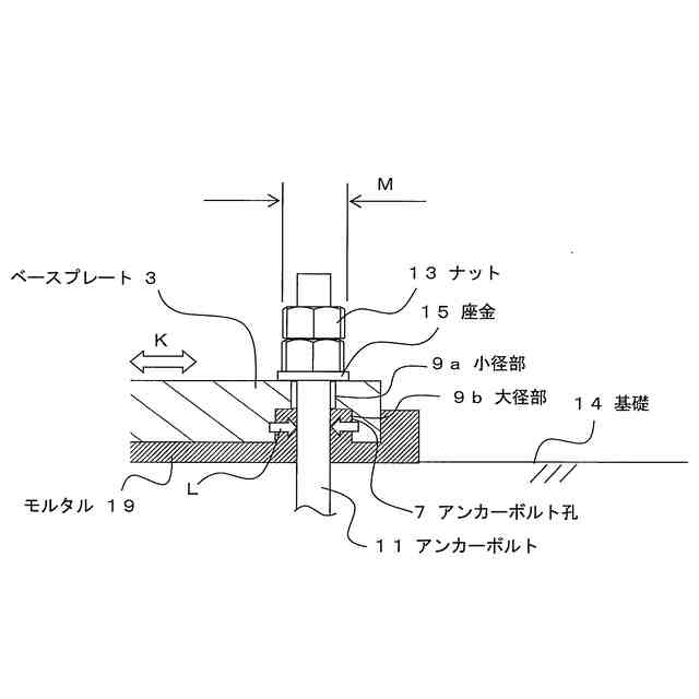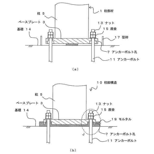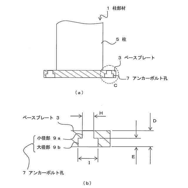 【解決手段】 ベースプレート3の四隅近傍には、貫通孔であるアンカーボルト孔7が設けられる。ベースプレート3の上面には、柱5の一端が接合される。アンカーボルト孔7は、相対的に径が小さい孔である小径部9aと、相対的に径が大きい孔である大径部9bとで構成される。小径部9aは、ベースプレート3の上面側に形成され、大径部9bは、ベースプレート3の下面側には形成される、すなわち、アンカーボルト孔7は、上部と下部とで孔のサイズが異なる。