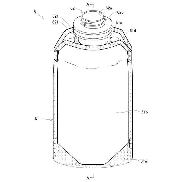 なお、特許文献3には、袋容器を直立状体で支持するための薄いシート材を折り曲げて形成されたホルダーも提案されている。この場合、薄いシート材を用いることで、硬質部品よりも樹脂の使用量を削減できる。