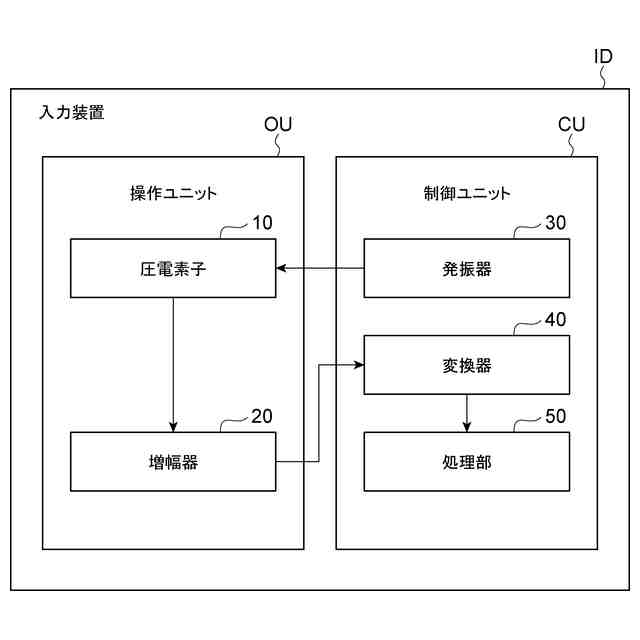 上述した入力装置では、複数の圧電体のうちいずれかの圧電体に電圧が印可されることによって、当該圧電体が変位する。電圧が印可された圧電体の変位は、筐体を介して、電圧が印可されていない圧電体に伝わる。以下、電圧が印可された圧電体は「第一圧電体」と称されることがあり、電圧が印可されていない圧電体は「第二圧電体」と称されることがある。筐体が操作体から力を受ける場合、当該力に応じた拘束力が、筐体に作用する。したがって、筐体が操作体から受ける力に応じて、筐体を介した、第一圧電体と第二圧電体との間における変位の伝わりやすさが変化する。これによって、操作体から受ける力に応じて、第二圧電体の変位が変化する。第二圧電体の変位が変化すると、第二圧電体に生じる電荷も変化する。上述した入力装置では、操作体から受ける力に応じて、筐体を介した第一圧電体と第二圧電体との間における変位の伝わりやすさが変化することを利用して、操作体から受ける力に関する情報が取得される。一方で、上述した入力装置では、第一圧電体の変位が、筐体を介して、第二圧電体に伝わるので、操作体から受ける力に関する情報の精度の点で改善の余地を有する。
