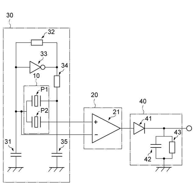 上記別の態様では、電圧が第一部分に印加される。電圧が第一部分に印加されることによって、第一部分が変位する。これによって、第一部分の変位が第二部分に伝わり、第二部分が変化する。圧電素子が操作体から力を受ける場合、当該力に応じた拘束力が、第一部分及び第二部分を含む一つの圧電体に作用する。したがって、圧電素子が操作体から受ける力に応じて、第二部分の変位のしやすさが変化する。すなわち、圧電素子が操作体から力を受ける場合、当該力に応じて、第二部分の変位が変化する。第二部分の変位が変化することによって、第二部分に生じる電荷も変化する。