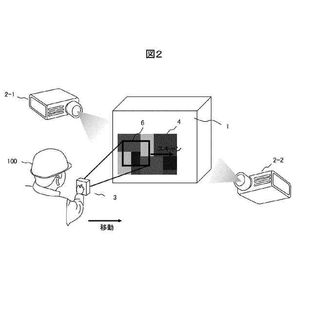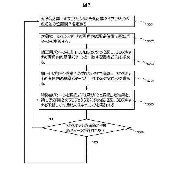 測定対象物に特徴的な模様や形状が無い場合、特徴点を抽出できないが、パターンを対象物に照射することで、取得可能な特徴点を追加することができる。さらに3Dスキャナ(以下、カメラと表現することもある)を対象物に近い距離で移動させて三次元計測することにより、高精度かつ広い範囲でモデリングすることが可能である。3Dスキャナと対象物の距離を近接していくと、投影機(以下、プロジェクタと表現することもある)で投影しているパターンを3Dスキャナ(あるいはさらに3Dスキャナを操作している人や機器)が遮ってしまうことがある。このような場合にはパターンがカメラの影の影響で変わってしまい、特徴点の不一致が発生したり、特徴点の数が減ったりするため三次元計測の精度が低下するという課題がある。
