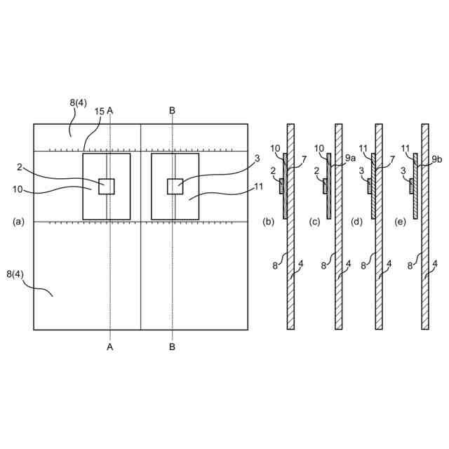 (a)は座圧用感圧センサを取り付けたマットの概略平面図であり、(b)は(a)の点線A-Aにおける右座圧用感圧センサ及びマットの概略断面図であり、(c)はマットとマットから取り外した右座圧用感圧センサの概略断面図であり、(d)は(a)の点線B-Bにおける左座圧用感圧センサ及びマットの概略断面図であり、(e)はマットとマットから取り外した左座圧用感圧センサの概略断面図である。