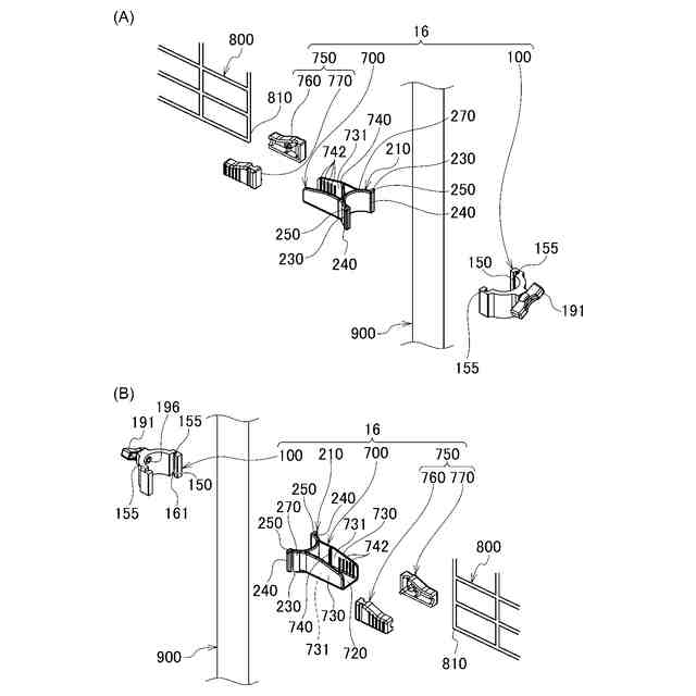 前記副部材は、Jの字状のフック、棚としての棚部、ハンガーを吊り下げる吊り下げ部、突っ張り棒を取り付けるための突っ張り棒取り付け部、し突っ張り棒を取り付けるための渡し突っ張り棒取り付け部、網を取り付けるためのホルダーを保持するホルダー受け部、のいずれかを有し、