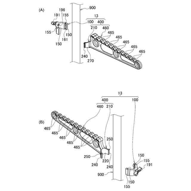 しかしながら、一度使用した後に不要となった場合や、新たに、他のハンガー等を基幹ポールである突っ張り棒に取り付けるためには、突っ張り棒を、すでに設置した場所から取り外し、その不要となった掛けバー軸胴部(17)を取り外し、新たなハンガーや棚を取り付けるための掛けバー軸胴部(17)に相当するアダプターを取り付け、再び設置した場所にその突っ張り棒を設置しなければならず、極めて不利不便である。