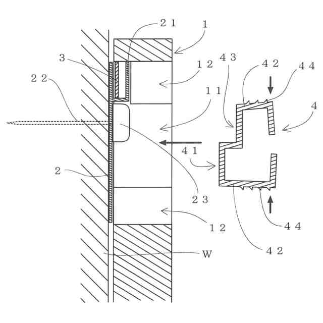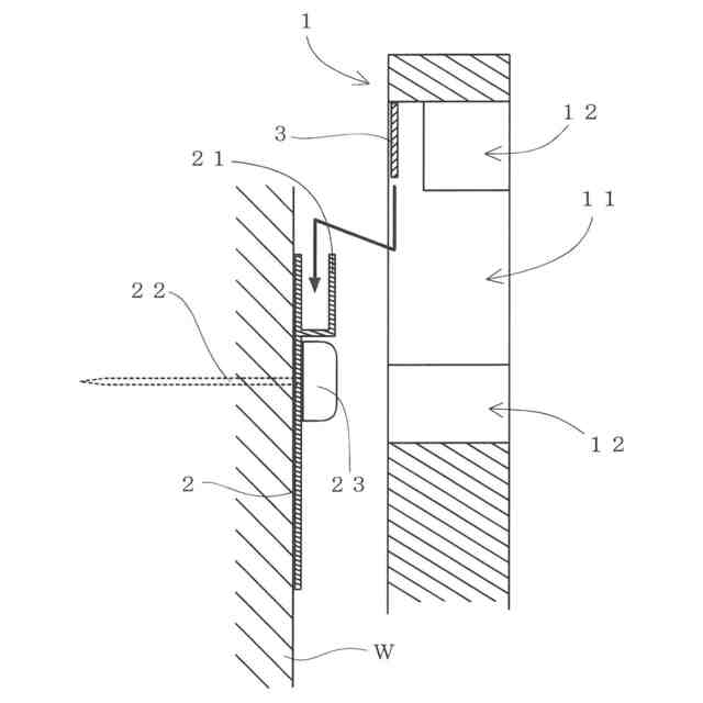 前記壁面Wには、鉛直上方に爪部21が突成されたフック2を、固定具22によって固定する一方、