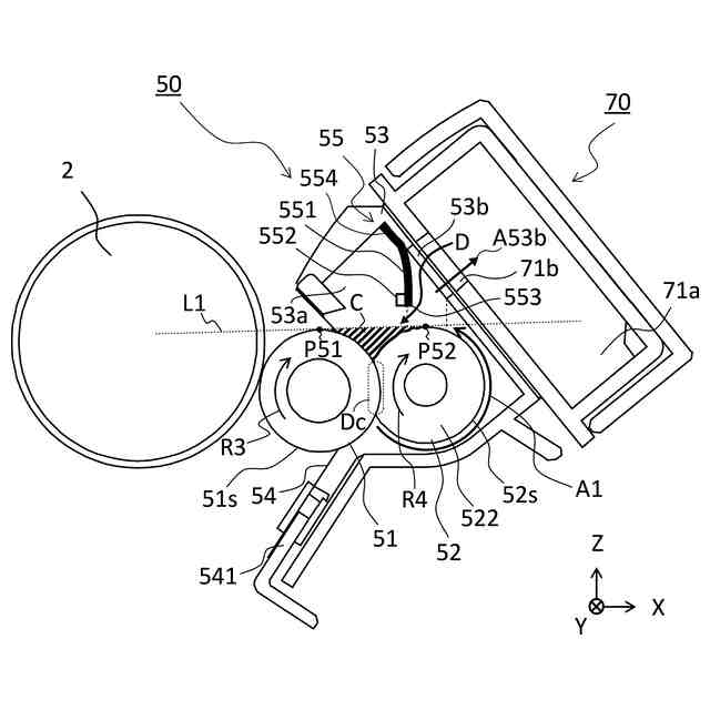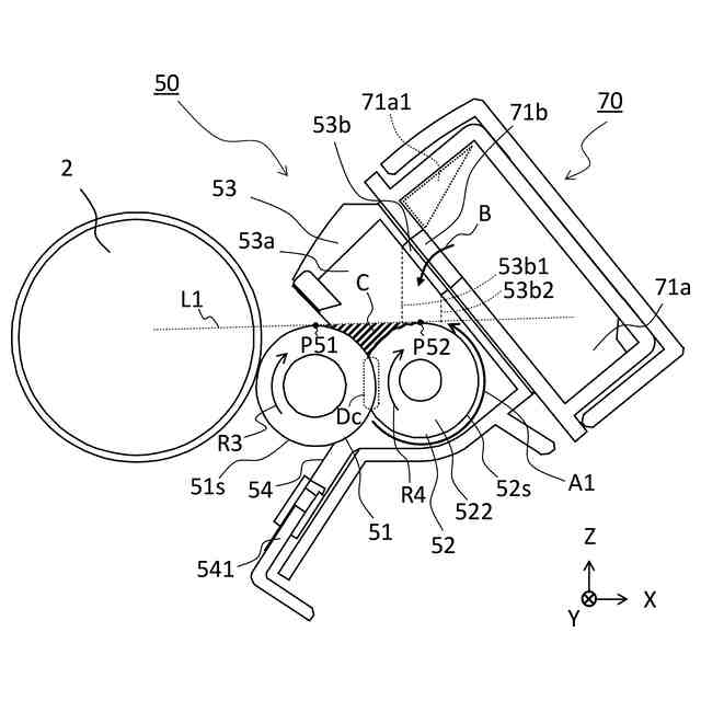 【解決手段】感光体と、収容部と受入開口とが設けられた収容枠体と、現像ローラと供給ローラとを有するロータリと、トナーカートリッジと、を備え、供給ローラは、発泡材料で形成され且つ供給ローラの外周面を形成する発泡層を有し、供給ローラと現像ローラとの接触部において発泡層が弾性変形するように配置されており、現像ローラの外周面と、供給ローラの外周面と、現像ローラの外周面及び供給ローラの外周面の共通接線と、によって囲まれる領域であって供給ローラの回転方向について接触部の下流側の領域を下流領域としたとき、ロータリが現像姿勢にある状態において、下流領域は受入開口の下方に位置し、且つ鉛直方向に見た場合に受入開口と少なくとも部分的に重なる。