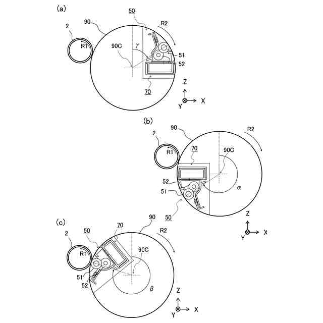 実施例1に係る感光ドラムと現像ユニット及びトナーカートリッジの位置関係を表す概略図(a~c)。