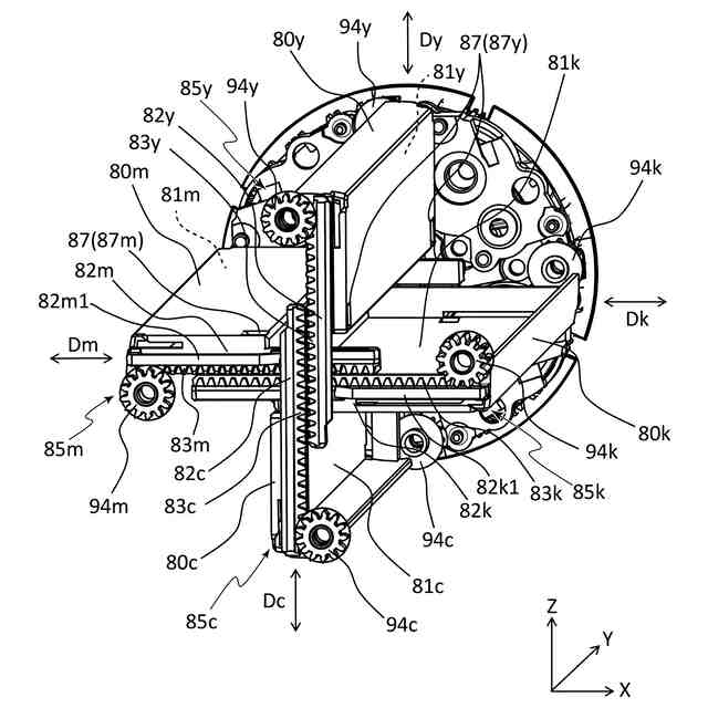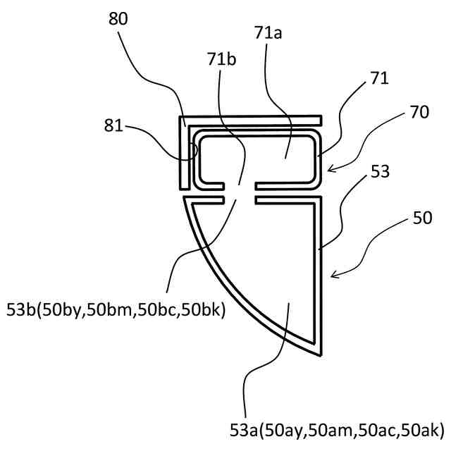 【解決手段】ロータリ本体90に取り付けられ、トナーカートリッジが取り外し可能に装着され、収容枠体に対して移動可能に支持されるトレイ80kであって、ドア14が開位置にある状態で、本体開口を通じて、トナーカートリッジが収容枠体に対して装着位置に位置される収容位置と、トナーカートリッジが退避位置に位置される取出位置と、に移動可能であるトレイ80kを備える。トナーカートリッジが収容枠体に対して装着位置にある状態で、排出開口と受入開口とが互いに対向し、ドア14が開位置に位置し、かつ、トレイ80kが取出位置に位置する際に、トレイ80kが収容枠体及び支持面172に支持され、かつ、トレイ80kが支持面172から離れる方向へ移動することが規制されるように、ドア被係合面171がトレイ80kに係合する。