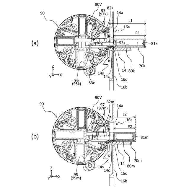 実施例1の変形例に係るトレイの移動に関する構成の説明図(a、b)。