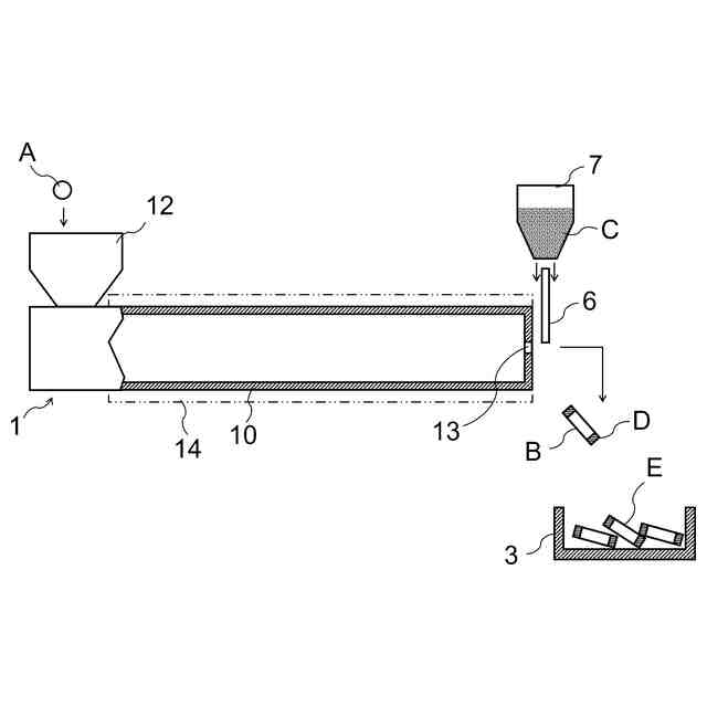 [8]熱可塑性樹脂を主体とする合成樹脂類を加熱した状態で押出し成形し圧縮体を得るための押出し成形機と、