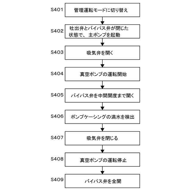 一態様では、前記運転方法は、前記主ポンプの運転が停止した後に、管理運転モードを実行することをさらに含み、前記管理運転モードは、前記吐出弁および前記バイパス弁を閉じた状態で、前記主ポンプを起動し、前記真空ポンプの運転を開始し、前記バイパス弁を中間開度まで開き、前記ポンプケーシング内の満水が検出された後に、前記真空ポンプの運転を停止し、その後、前記バイパス弁を全開にする。