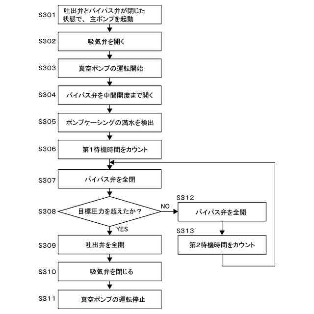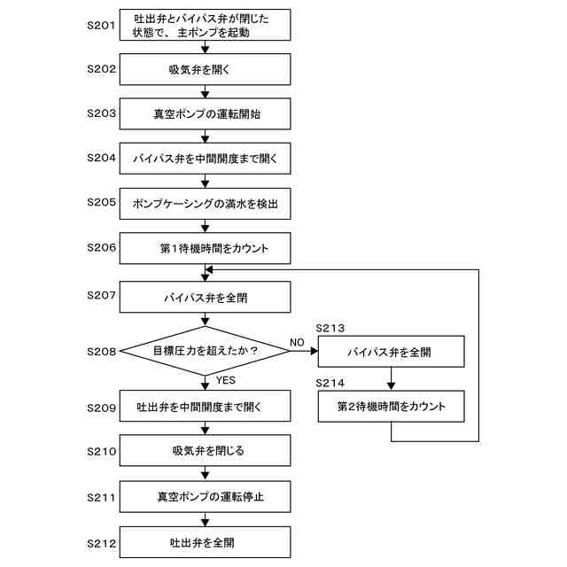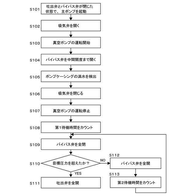 一態様では、前記運転方法は、前記ポンプケーシング内の圧力が前記所定の目標圧力を下回っているときは、前記バイパス弁を開き、所定の第2待機時間をカウントし、前記所定の第2待機時間経過後に、前記バイパス弁を閉じ、その後、前記ポンプケーシング内の圧力が前記所定の目標圧力まで上昇しているか否かを再度判定することをさらに含む。