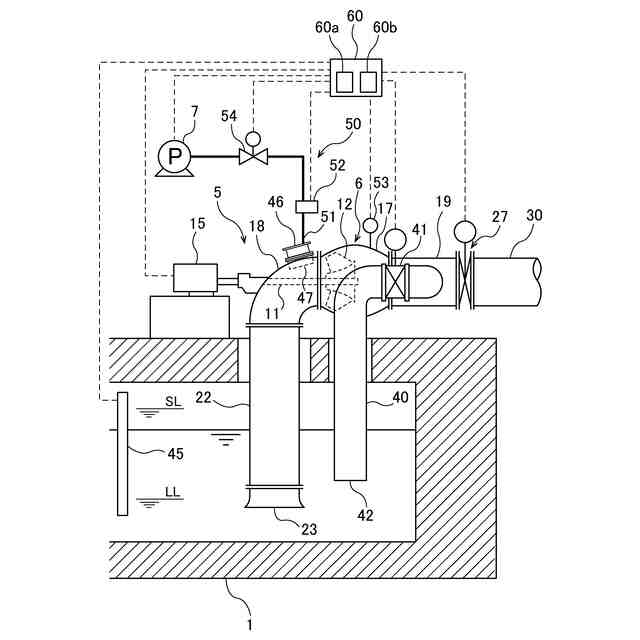 そこで、これらの課題に対し、特許文献1に示されるように、気液分離機構と旋回防止板を用いたポンプ設備および運転方法が提供されている。この特許文献1は、主ポンプを運転させながら、真空ポンプでポンプケーシング内の空気を排出する技術を提供する。この技術によれば、電動機の始動電流を抑制し、安価で簡素な横軸ポンプを提供することができる。
