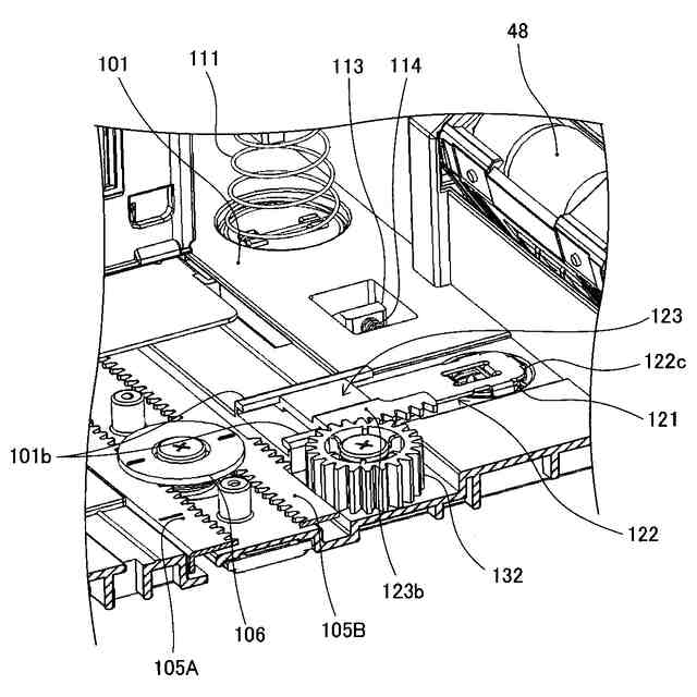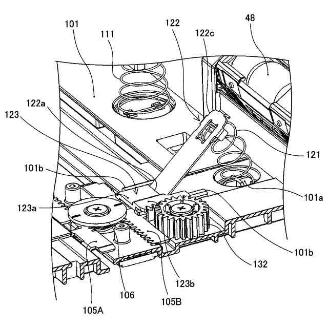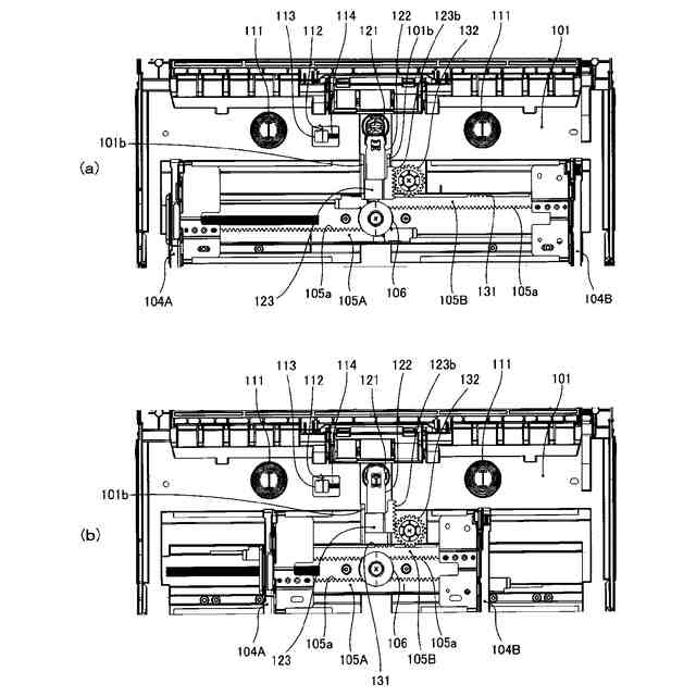 詳しくは、押し上げレバーの回転軸上には、前記2つの押し上げばねのそれぞれの付勢力によって回転する2つの回転レバーが設けられており、第一押し上げばねに対応する第一回動レバーは押し上げレバーの回転軸と常に一体的に回転する。一方、第二押し上げばねに対応する第二回動レバーは、押し上げレバーの回転軸と係合する係合状態と係合しない非係合状態とに切替可能な構成となっている。大サイズシートに対応する位置に幅規制部材が変位した場合、第二回動レバーは押し上げレバーの回転軸と係合状態になり、2つの押し上げばねの付勢力が2つの回動レバーを介して押し上げレバーに付与され、押上板を上方へ押し上げる。小サイズシートに対応する位置に幅規制部材が変位した場合、第二回動レバーは押し上げレバーの回転軸と非係合状態になり、第一押し上げばねの付勢力のみが第一回動レバーを介して押し上げレバーに付与され、押上板を上方へ押し上げる。