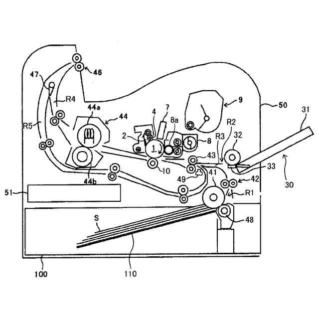 同図において、本プリンタは、潜像担持体としての感光体1や、本体筐体50に対して着脱可能に構成されたシート収容装置としての給紙カセット100などを備えている。給紙カセット100の内部には、複数の記録シートSをシート束の状態で収容している。