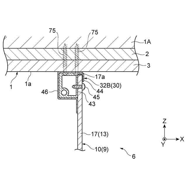 【解決手段】ディスプレイカバー6は、ディスプレイ5と向かい合うように配置され、ディスプレイ5から出射される光を透過する正面板12と、正面板12の周縁部から建築壁1に向けて立設する側板13と、正面板12の表面上に設けられ、光を透過する化粧シート11と、を備え、正面板12は、ディスプレイ5と向かい合う方向から見た場合にディスプレイ5と重なる表示領域12aと、表示領域12aの周囲に表示領域12aを取り囲むように配置された周辺領域12bと、を有し、周辺領域12bにおけるディスプレイ5側の内面12cには、光透過率が化粧シート11の光透過率よりも低い黒色シート51が設けられている。