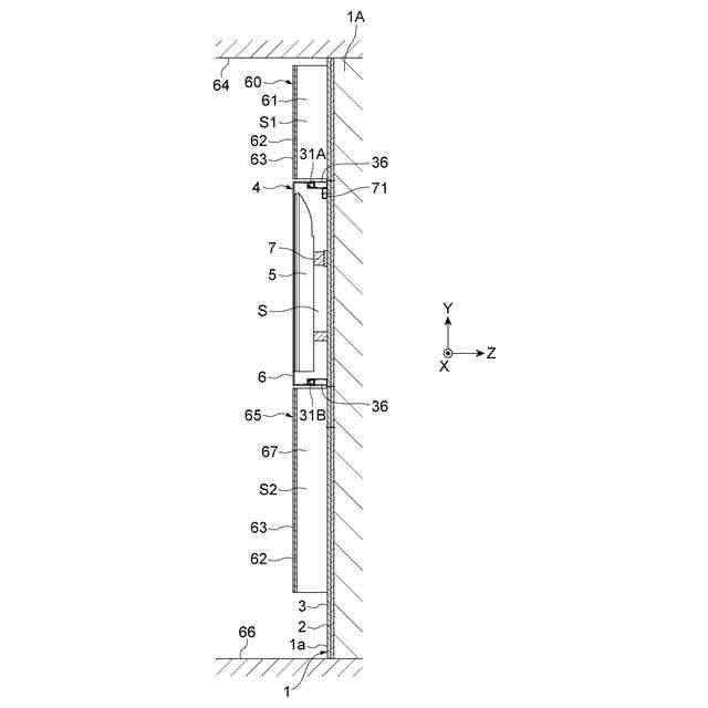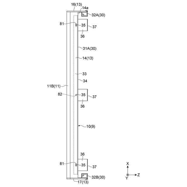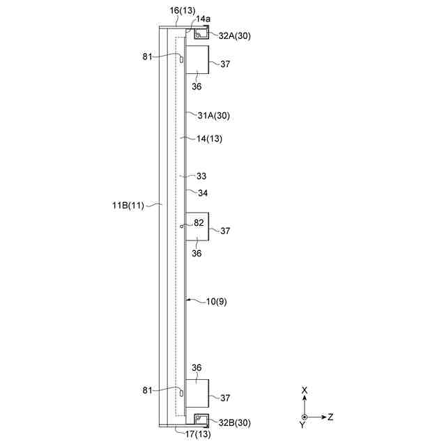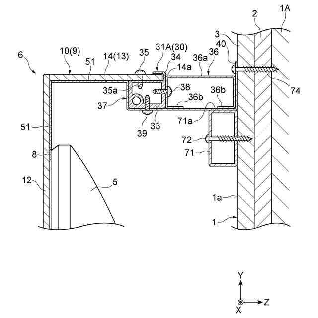 【解決手段】ディスプレイカバー6は、ディスプレイ5と向かい合うように配置され、ディスプレイ5から出射される光を透過する樹脂製の正面板12と、正面板12の周縁部から建築壁1に向けて立設する樹脂製の側板13と、正面板12の表面上に設けられ、光を透過する化粧シート11と、側板13における正面板12とは反対側に複数のネジ35により固定され、ディスプレイカバー6を建築壁1に支持するための支持部材30と、を備え、側板13には、ネジ35の軸部35aが貫通する締結孔81,82が形成されており、締結孔81は、側板13の長手方向に沿って延びるような長円形状を呈している。