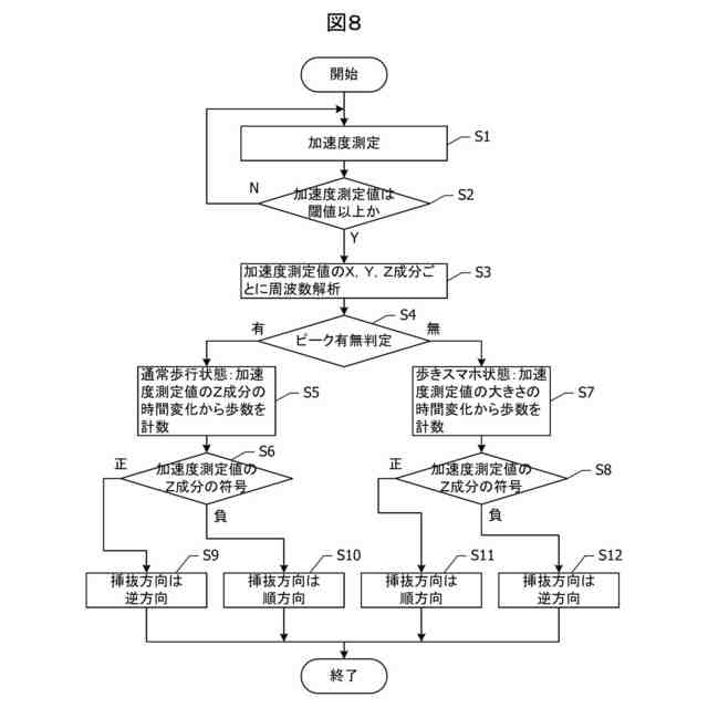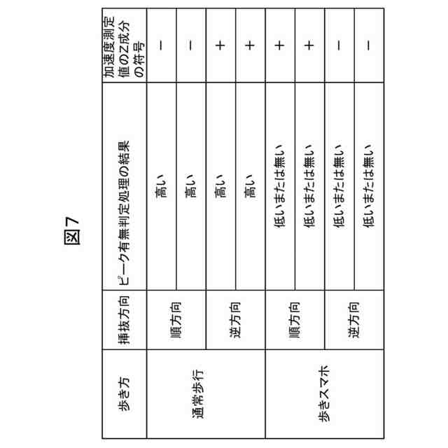 上述のピーク有無判定処理により、通常歩行状態か、スマートフォン等を持って歩行している状態かを判別することができる。この歩行状態の別、及び加速度測定値のZ成分の符号に基づいて指装着デバイスの装着の向きを判定するため、判定精度を高めることができる。